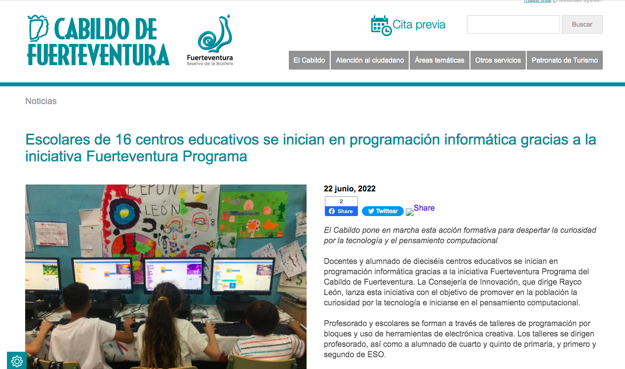 Docentes y alumnado de dieciséis centros educativos se inician en programación informática gracias a la iniciativa Fuerteventura Programa del Cabildo de Fuerteventura. La Consejería de Innovación, que dirige Rayco León, lanza esta iniciativa con el objetivo de promover en la población la curiosidad por la tecnología e iniciarse en el pensamiento computacional.