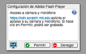3. Crear un nuevo objeto utilizando la cámara de nuestro ordenador: para ello, es importante que cuando el ordenador te permiso para acceder a la webcam y al micrófono del equipo informático para capturar imágenes y sonidos para incorporar en un proyecto de Scratch selecciones el botón de aceptar.