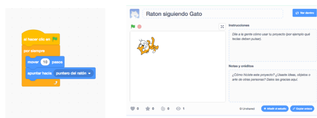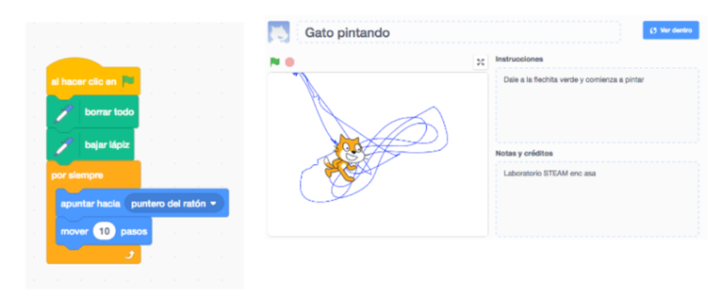 Vamos a aprender un poquito más y vamos a programar nuestros objetos para que nos permitan realizar dibujos mientras que se mueven. Hacer que a nuestro gatito le siga el ratón de nuesto ordenador.